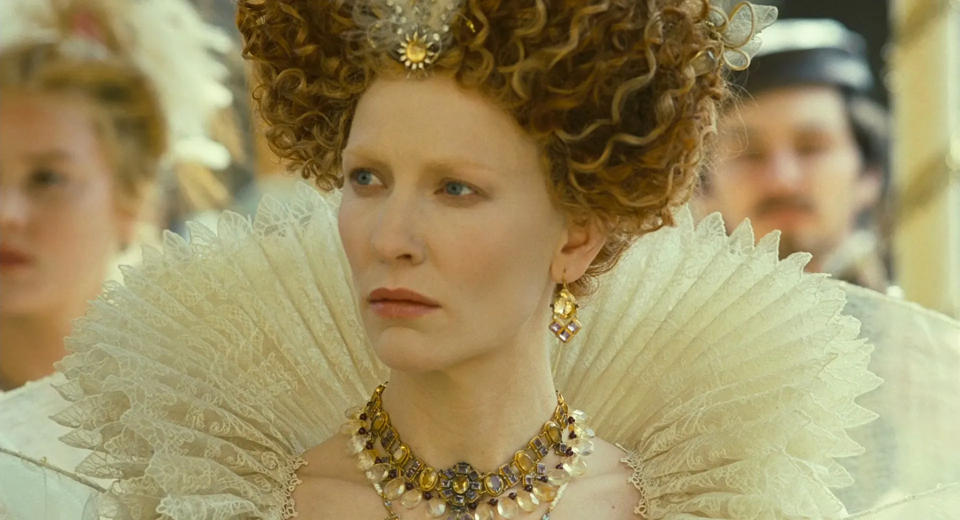 Cate Blanchett as Elizabeth I, Clive Owen as Sir Walter Raleigh, Geoffrey Rush as Sir Francis Walsingham, Laurence Fox as Sir Christopher Hatton, Tom Hollander as Amyas Paulet, Abbie Cornish as Elizabeth Throckmorton, Rhys Ifans as Robert Reston, Jordi Mollà as Philip II, Samantha Morton as Queen Mary, Eddie Redmayne as Anthony Babington, Adrian Scarborough as Calley, Adam Godley as William Walsingham, Christian Brassington as Archduke Charles, Robert Cambrinus as Count Georg von Helfenstein, David Threlfall as Dr. John Dee, Vidal Sancho as Spanish Minister, Kelly Hunter as Ursula Walsingham, John Shrapnel as Lord Howard, Sam Spruell as Torturer, David Sterne as Cellarman, David Robb as Admiral Sir William Winter, Jonathan Bailey as Courtier, Steve Lately as Walsingham's Servant, Kate Fleetwood as Woman with Baby, Aimee King as Infanta, Susan Lynch as Annette, Kristin Coulter Smith as Mary Walsingham, Hayley Burroughs as Queen Elizabeth's Waiting Lady #1, Kirsty McKay as Queen Elizabeth's Waiting Lady #2, Lucia Ruck Keene as Queen Elizabeth's Waiting Lady #3, Lucienne Venisse-Back as Queen Elizabeth's Waiting Lady #4, Elise McCave as Laundry Woman, Penelope McGhie as Margaret, Coral Beed as First Court Lady, Rosalind Halstead as Second Court Lady, Steven Loton as Manteo, Martin Baron as Wanchese, David Armand as Walsingham's Agent, Steven Robertson as Francis Throckmorton, Jeremy Barker as Ramsey, George Innes as Burton, Kirstin Smith as Mary Walsingham, Tim Preece as Old Throckmorton, Benjamin May as Dance Master, Glenn Doherty as Royal Servant, Chris Brailsford as Dean of Peterborough, Dave Legeno as Executioner, Antony Carrick as Spanish Archbishop, John Atterbury as Marriage Priest, Alex Giannini as First Spanish Officer, Joe Ferrara as Second Spanish Officer, Alexander Barnes as Courtier, Charles Bruce as Courtier, Jeremy Cracknell as Courtier, Benedict Green as Courtier, Adam Smith as Courtier, Simon Stratton as Courtier, Crispin Swayne as Courtier, Kitty Fox as Mary Stuart's Lady in Waiting, Kate Lindesay as Mary Stuart's Lady in Waiting, Katherine Templar as Mary Stuart's Lady in Waiting, Morne Botes as Courtier (uncredited), James Fiddy as Nobleman (uncredited), Finn Morrell as Young Boy (uncredited), Shane Nolan as Tyger Salior (uncredited)